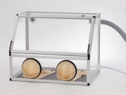 Handschuhbox mit automatischer Reduktion der Luftfeuchte in Arbeitsraum und Schleuse auf unter 20 % durch automatische Trockeneinheiten und Trockenmittelkassetten. Frontseite mit zwei Eingriffsöffnungen mit einem Paar Handschuhe Größe 9 aus Naturkautschuk. Ausgestattet mit je einem Hygrometer in Arbeitsraum und Schleuse. Das Tablett ragt bei Türöffnung in den Arbeitsraum zur einfachen Entnahme eingebrachter Produkte.